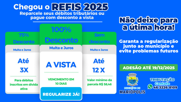 Regularizar seus débitos é garantir tranquilidade para você e mais desenvolvimento para Mariópolis. O REFIS 2025 oferece condições especiais para que cada contribuinte possa colocar sua situação em dia com segurança e facilidade. Aproveite os descontos, organize suas finanças e evite problemas futuros.