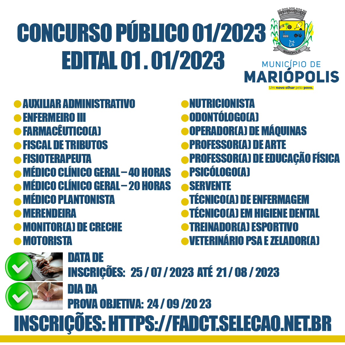 EDITAL DE CONVOCAÇÃO N°21-2025O Prefeito Municipal de Mariópolis, Estado do Paraná, no uso de suas atribuições legais, mediante as condições estipuladas neste Edital, em conformidade com o artigo 37, II, da Constituição Federal e demais disposições atinentes à matéria torna público o presente Edital que estabelece as instruções para realização de CONCURSO PÚBLICO de provas e títulos para provimento dos cargos para a Prefeitura Municipal sendo Assistente Social, Auxiliar Administrativo, Enfermeiro III, Farmacêutico(a), Fiscal de Tributos, Fisioterapeuta, Médico Clínico Geral – 40 horas, Médico Clínico Geral – 20 horas, Médico Plantonista, Merendeira, Monitor(a) de Creche, Motorista, Nutricionista, Odontólogo(a), Operador(a) de Máquinas, Professor(a) de Arte, Professor(a) de Educação Física, Psicólogo(a), Servente, Técnico(a) de Enfermagem, Técnico(a) em Higiene Dental, Treinador(a) Esportivo, Veterinário PSA e Zelador(a).