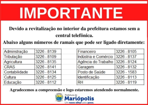 AVISO IMPORTANTE SOBRE A CENTRAL TELEFÔNICA DA PREFEITURA MUNICIPAL.