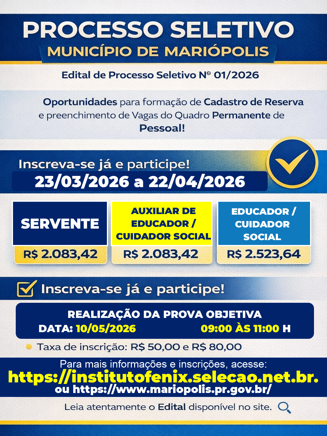 O MUNICÍPIO DE MARIÓPOLIS, PR, torna pública a realização do Processo Seletivo para abertura de formação de cadastro de reserva para estágio remunerado de Ensino Médio, Ensino Superior e Pós-Graduação, para atuarem junto à Prefeitura Municipal de Mariópolis, PR.